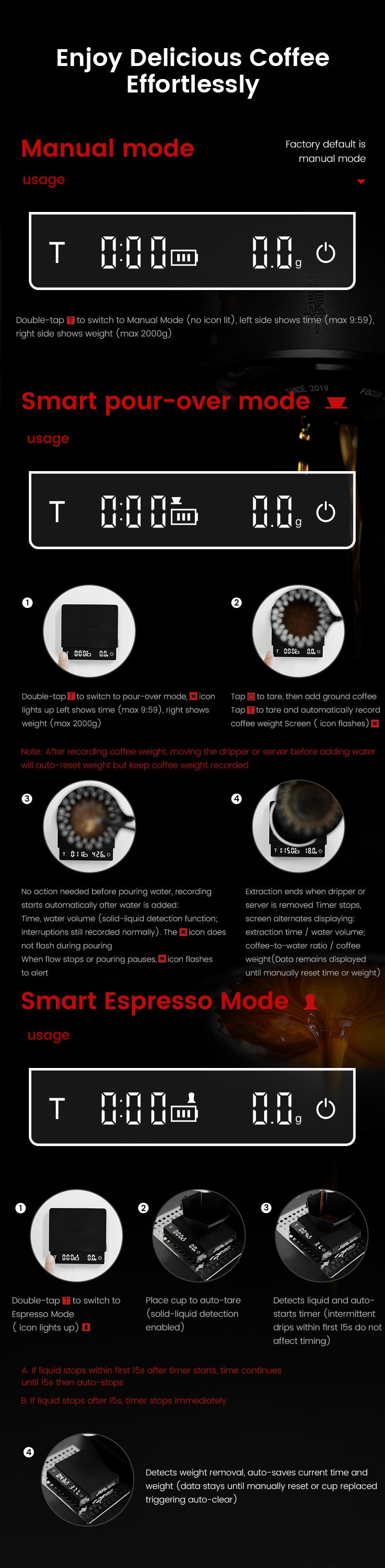 Versatile Brewing Modes and Smart Features: Equipped with an ultra-sensitive sensor, the Cube Coffee Scale 3.0 Micro offers three modes—Manual, Pour-Over, and Espresso—ensuring precise timing, weight tracking, and solid-liquid detection for each brewing method. Its smart memory function remembers your last settings, and the 50g gravity wake-up ensures it’s always ready when you are. Switching between modes is simple, thanks to its anti-mistouch design.
