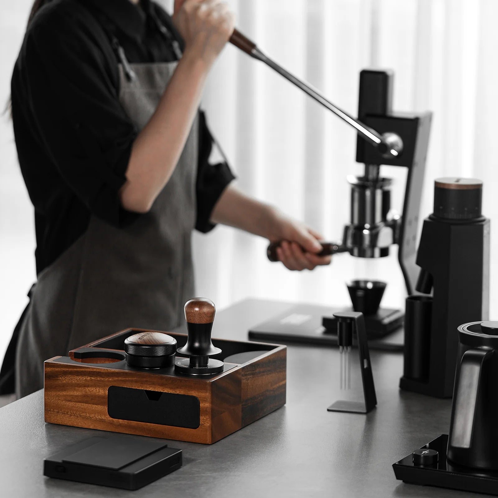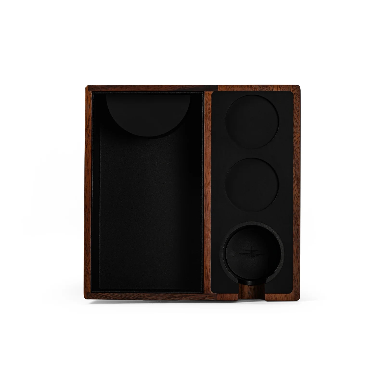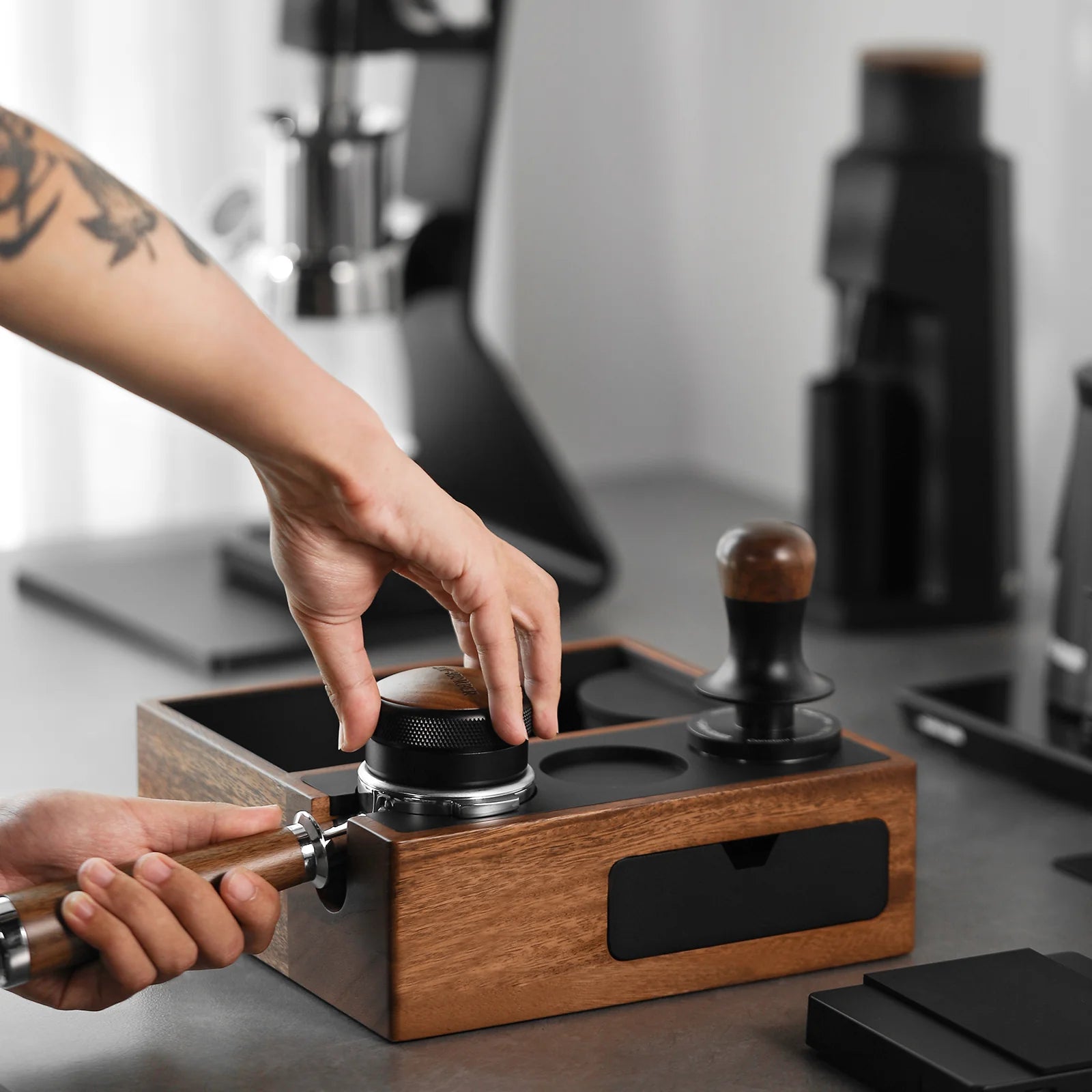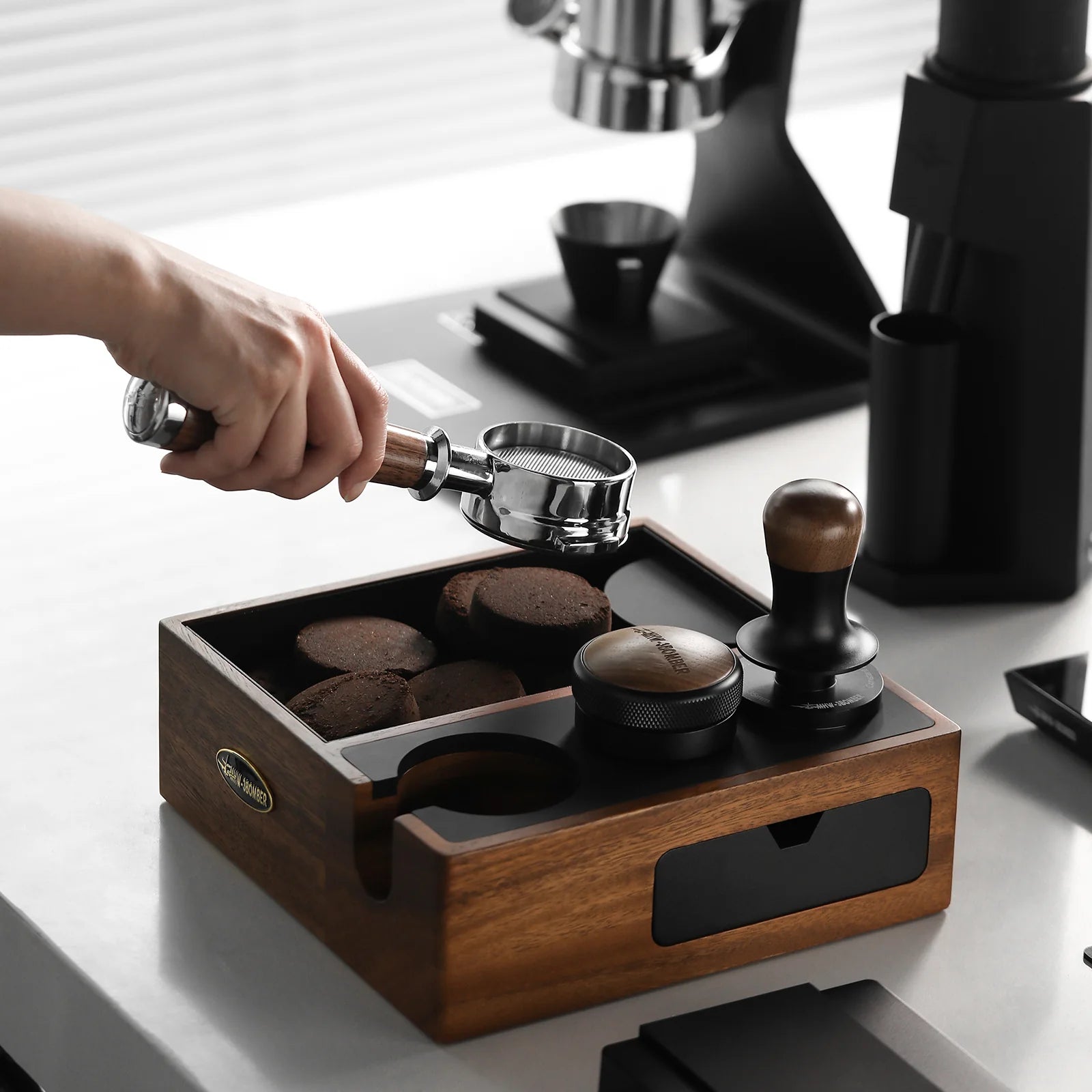 - NEWLY UPGRADED: Silicone pads have been added to the surface to minimize the impact on the portafilter during use and prevent damage to the coffee accessory. A magnetic storage drawer is also added to the side of the box, which can be used to store the espresso puck screen, portafilter basket, and other coffee tools.