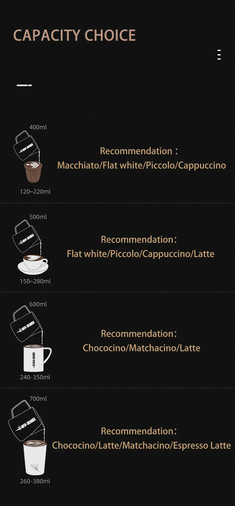 - Superior and Secure Materials: The body of the frothing pitcher is completely smooth, with no signs of mechanical welding, making it incredibly smooth and attractive. The espresso steaming pitcher is made of premium austenitic 304 stainless steel.