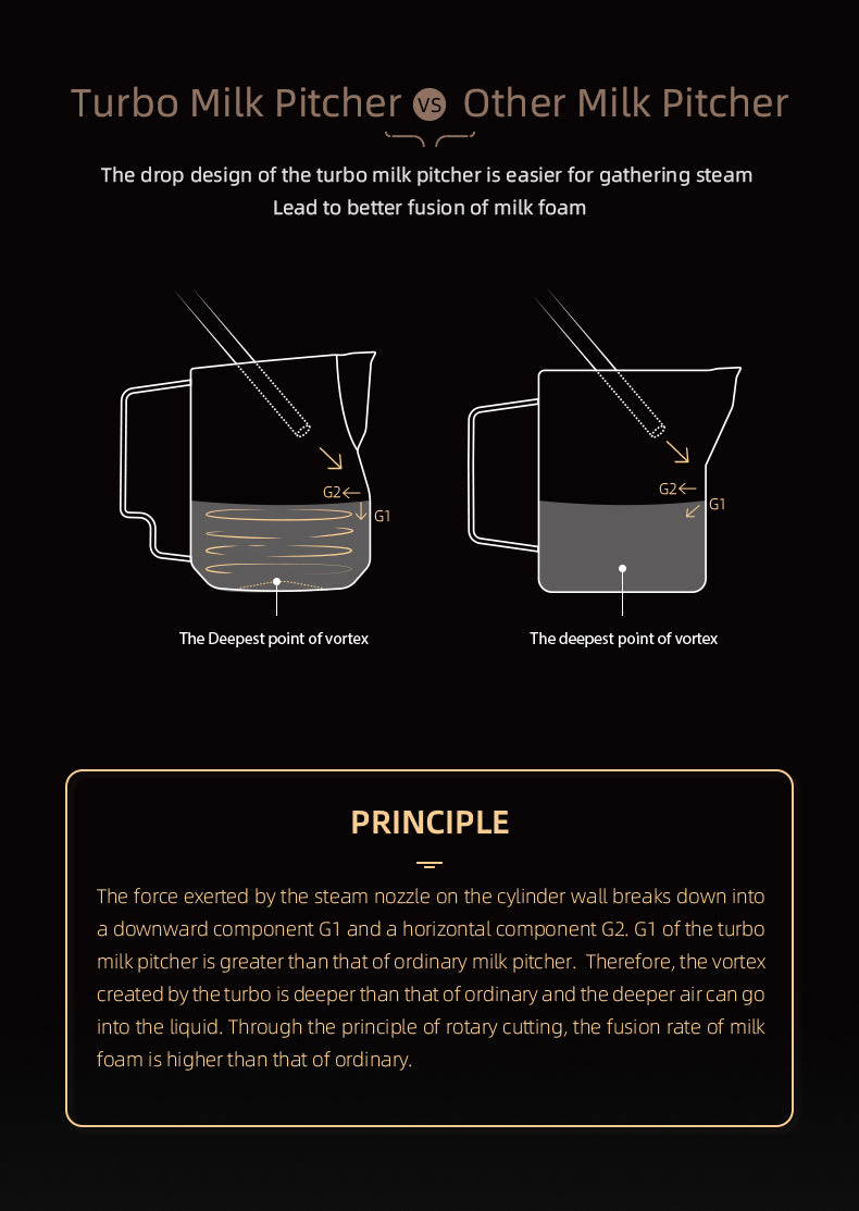 - Brilliant Design: The pitcher’s double-arced diversion trench enhances the release of milk foam, making it ideal for creating beautiful latte art. Its design not only facilitates smooth milk frothing but also adds an element of fun to the process.